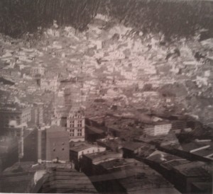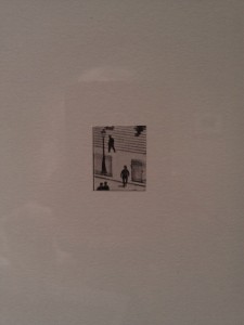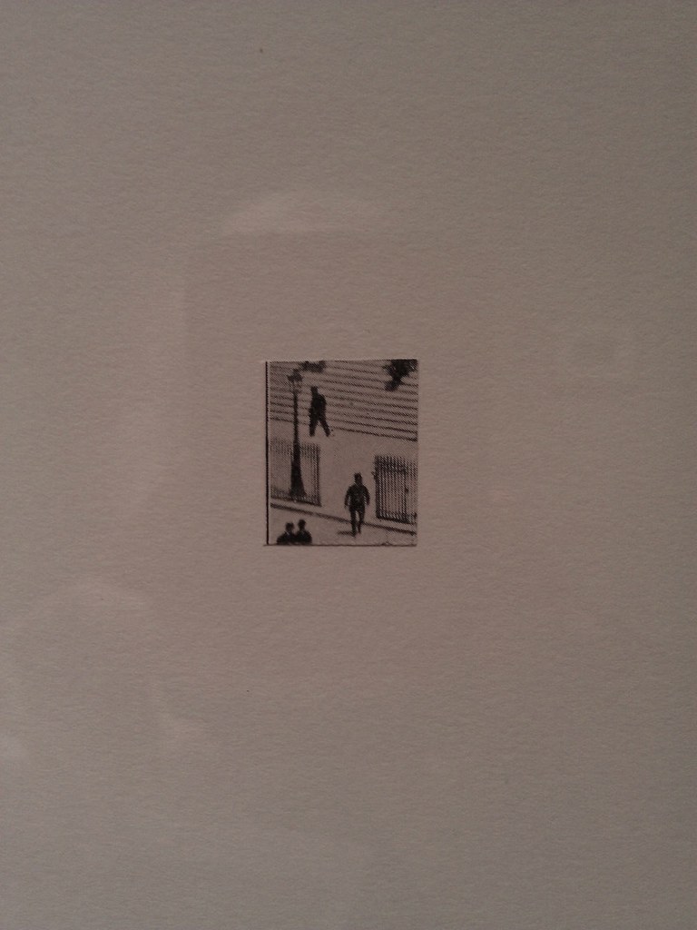 My favorite piece was a series of seven collages (see top image), although calling them collages is a sly trick. The images are simply stamp-size cut-outs from larger images. Each cut out is a single, intact rectangle glued in the center of an approximately 8″ tall mat board. The images highlight tiny figures in action excised from some corner or background of larger images–the things we rarely pay attention to as our editing eyes and minds focus in on the main subject. The line-up of seven suggests a cinematic storyboard, with a mysterious tale to tell of something momentous about to happen.