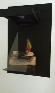 Furthermore, cyberspace and a scary future are not Frech’s only subject here. He creates in real space a sort of hearth, with real charred logs on a shelf, and a tilted glass which reflects fire (from a moving image on a screen above). The flame reflection licks and dances like a real flame atop the charred logs. The Payne’s Ghost technique works beautifully here, and there’s so much concrete reality in the construction that the faux fire feels like it crosses over into heat. This piece would be great in any house that needs the visual focus of a hearth–plus you can run it in summer without overheating the house!