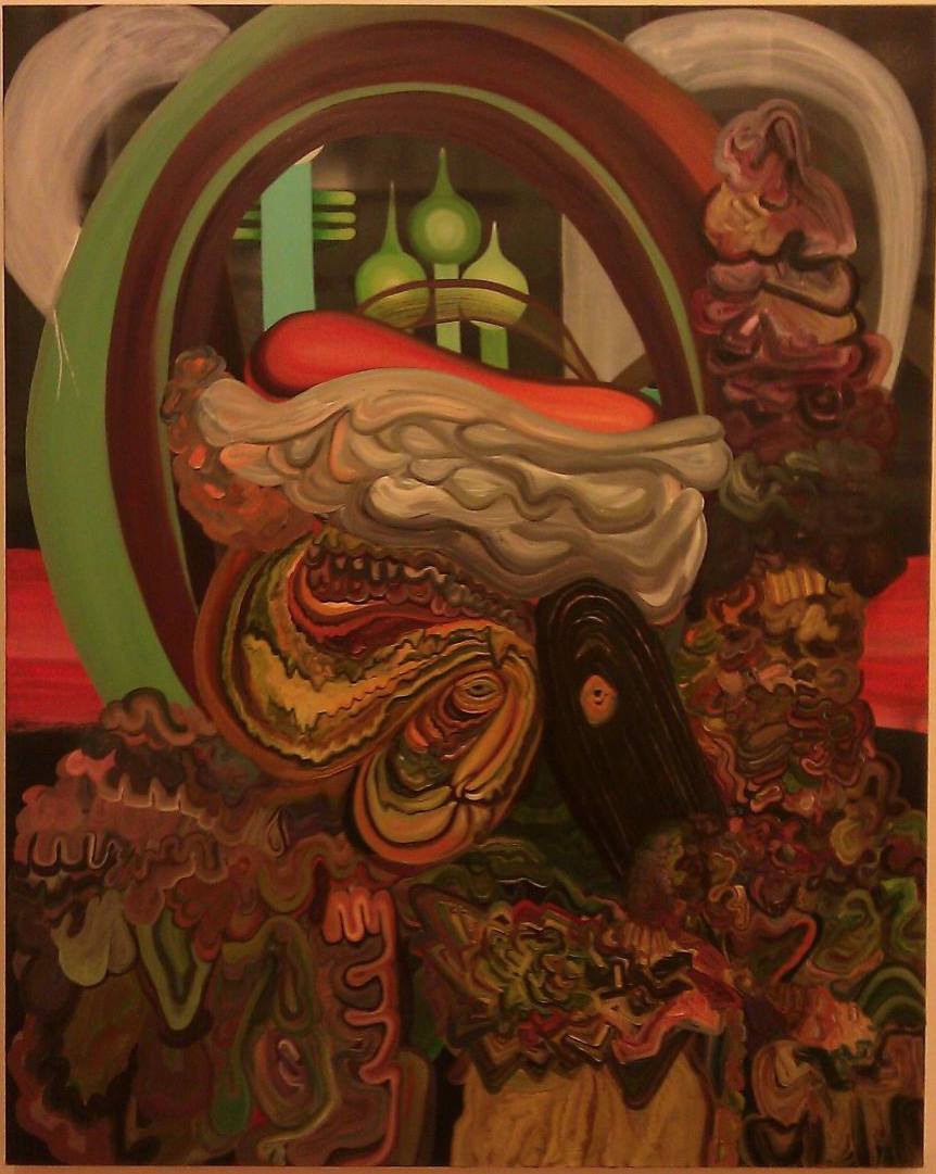 At times, the colors in Alana Bograd’s fantasy paintings sweep me away. Other times I’m charmed by a blobby image of a reality filled with ogres and beasts amid the onion domes of Europe. Stacks like piled up hamburgers in buns stare out of heavy-lidded eyes, suggesting an animate earth on the watch. This is not a safe place, and I enjoy the suggestion of a mythological backstory. I feel like the artist has outgrown some of her older fantasy material, but has not yet figured out what’s what, what really matters to her.