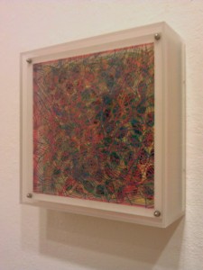 The third artist, Sarah Steinwachs, creates beautifully crafted cut-out patterns of colored mylar, layered in plexi shadowboxes. The resulting landscapes of pattern and moire effects at times suggest water, air, neurons and other systems. But the tight craftsmanship packed behind the surface of the plexiglass seems too contained. There’s potential for this work to evoke the cosmos, but it falls short. Somehow, somewhere, something’s got to give.