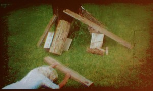 A soundtrack of heavy breathing permeated Thwing’s gallery space. One small video is of a tiny bird struggling to breathe. A huge almost comic-strip haystack in the corner heaves up and down beneath a spotlight. Another video, Workshop (four minutes), is filled with metaphors for struggle, suffering, survival, creation and work. An apple is squeezed until it bursts. Buckets spin. A shrouded figure, the artist, creeps along the grass to accomplish some mysterious mission, leaning wood against a tree. A child hammers nails.