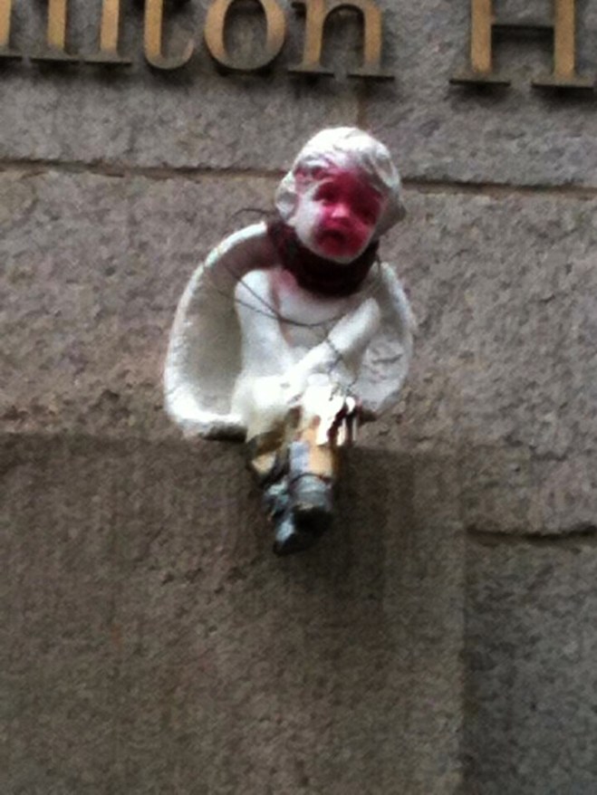 Dan Reidy’s work is just that: Inexplicably poignant. And it is best not to worry yourself about translating the equation between the original Prometheus myth and Reidy’s version − because it probably cannot be done. There is however a phone number to call. The following instructions accompany Reidy’s statement next to the outdoor installation: Ring this number for audio, 267-519-5646, #921. Reidy’s Prometheus may be a tragic prankster. In this case, the tragedy is the theft of the poor baby angel, put at risk by Dan Reidy, the prankster.