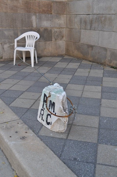 The chairs chained to the alabaster boulders relate to Prometheus’ theft and punishment, but a theft has taken place here too. When Reidy installed the work, an adopted, repaired, and doctored angel figurine was placed on a ledge of the building’s façade as part of the installation. At some point the figurine was taken (not by Reidy). This was, according to Reidy, “Very sad, I knew it was at risk, it was part of the idea to have something easily stolen and hope it did not come to pass.” Almost begrudgingly it seems, Reidy has invited theft. If this is so, he certainly must be sympathetic toward the perpetrator since the punishment — sitting in the plastic chairs — is, of course, optional. Of course an angel figurine is also not fire and needless to say, Reidy is not a god.