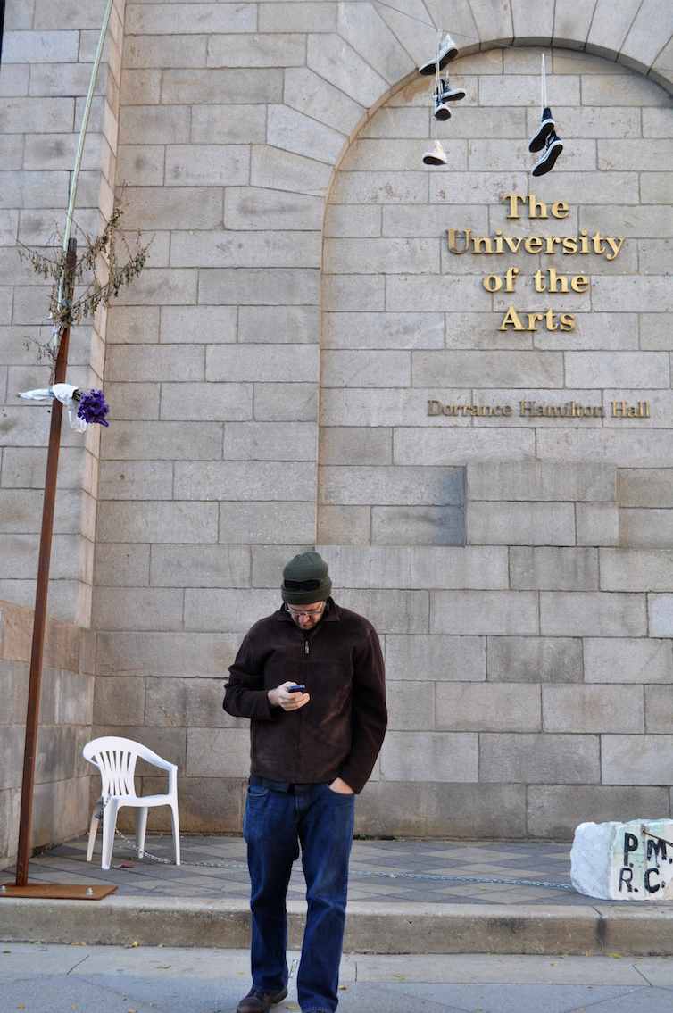 Prometheus stole fire from the gods and Zeus punished him by having him bound to a rock while a great eagle ate his liver, little bites at a time. Dan Reidy has brought his metaphorical adaptation of this drama to the Hamilton Hall platforms in front of the University of the Arts. On each of the platforms, a plastic lawn chair is chained to an alabaster boulder. On one side sneakers hang from a wire at the top of a metal pole. One boulder is labeled enigmatically with the initials P.M. R.C.