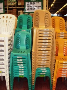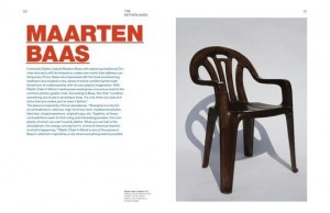 Design critic, Alice Rawsthorn, describes them as cheap, light, portable, waterproof, stackable and easy to clean. Yet their generic form offends educated eyes on the basis of style. The Infamous Chair includes four short essays by critics, writers and teachers of design, a conversation with several chair designers, and photographs of 26 responses to monoblocs by artists and designers. Philippe Starck, Konstantin Grcic and Jerszy Seymour produced serious re-styles of the down-market versions, all in current production (although Seymour’s, the least pricy of the three, still costs approximately 18 times as much as generic monoblocs). But most are snide adaptations that ignore the chair’s undeniable virtues. How amusing is Maarten Baas’ limited edition, monobloc-shaped chair, hand-carved in elmwood, or Tina Roeder’s monoblocs made into limited-edition collectibles by hand-perforating each with 10,000 holes?