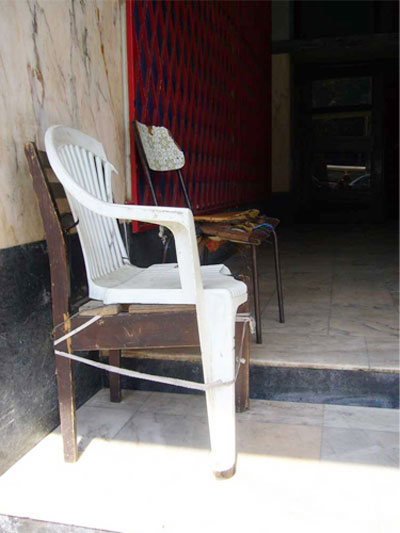 Far and away the most interesting aspect of the book are the photographs of monoblocs in widespread, international use: a bloodied chair in a bombed village east of Falluja; a plaza in front of Jerusalem’s Western wall, full of worshipers in monoblocs; a single chair in front of a yurt in Mongolia; monoblocs converted into affordable wheelchairs in Thailand; and a series of badly-damaged chairs in Cairo, crudely repaired for use. These constitute a visual essay on globalization, material inequities, the creative recycling of the poor and the possibilities of design for the 99% that will interest all readers with a curiosity about unrecorded, everyday life in the far corners of the globe.
