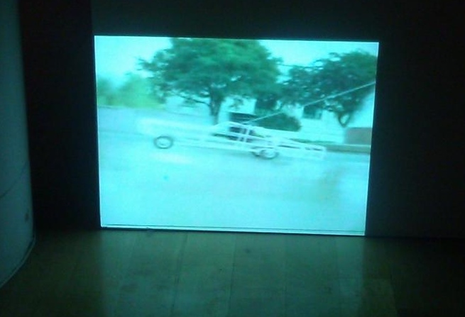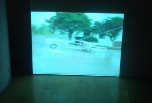 Chido Johnson’s video of a man (the artist I presume) walking the outline of a car on a leash is a poignant testament to imagination, yearning and the American Dream reduced to a pet car. This reminds me of South African video artist Robin Rhodes interacting with his chalk drawings as if they were the real thing.