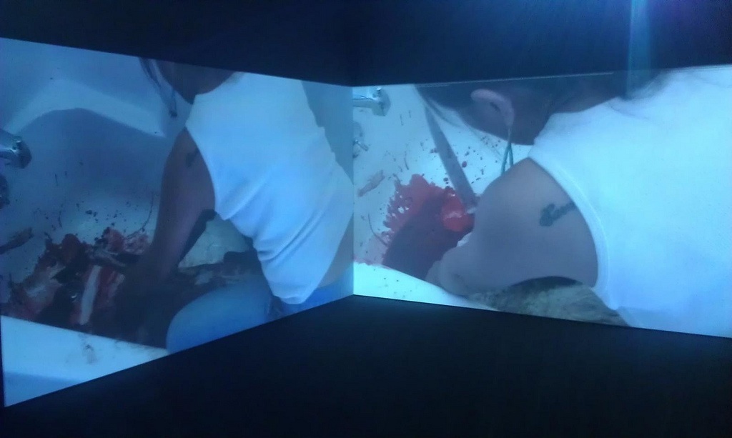 A video of a Native American ritual lamb slaughter in a motel bathtub, by Postcommodity, is a jolting displacement. In a way, this gory ritual elevates the seedy motel and its anonymity into a sacred place. At the same time the artists confront our (and PETA’s ? ) squeamish and romanticized misinterpretation of native peoples and their relationship to the earth and our fellow beasts.