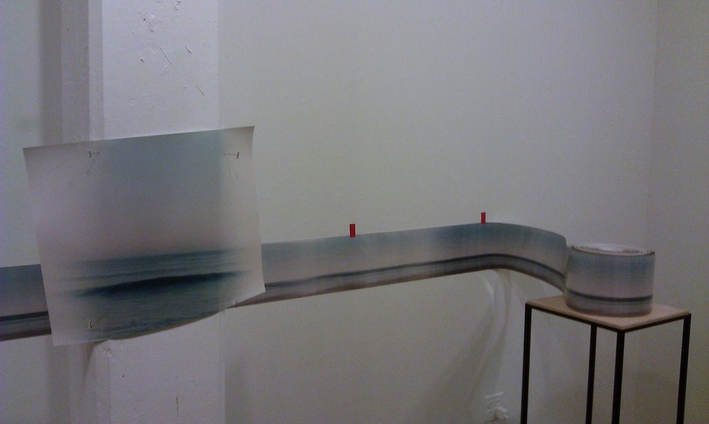 Giel’s main piece is a rolled-up, 305-foot long horizontal scroll of a seemingly endless seascape photograph, the end taped around the room like a chair rail. The image was made from a commonplace shot of the ocean from the Atlantic City boardwalk, he said. He dragged the exposure process across the length of the scroll in a darkroom during a 7-hour process in an effort to transcend the usual 2D image. He defined the work as a performance piece–starting in the darkroom and ending in the gallery installation.