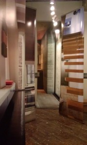 Alanna’s scrolls hang vertically, using design and architecture magazines as her source material for domestic spaces. But the spaces are anything but domestic. They are chilly yet meant to seduce. Of her blowups, she said that they too are seductive at the same time that they repel the eye with their commercial intent and their confusing, broken up spaces. The images are further broken up by the dot printing process of the original printed pages.