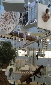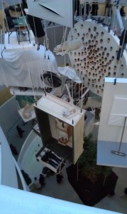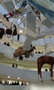 The experience has a Where’s Waldo quality, offering an opportunity to search and rummage through the artist’s past. Because the objects are often massive, are often mounted on floating plinths, and are numerous, they obscure one another, so the march up or down the ramp offers new perspectives and new revelations all along the way. The aerial act is both delightful and a constant revelation, filled with competing focal points–yes, a circus.