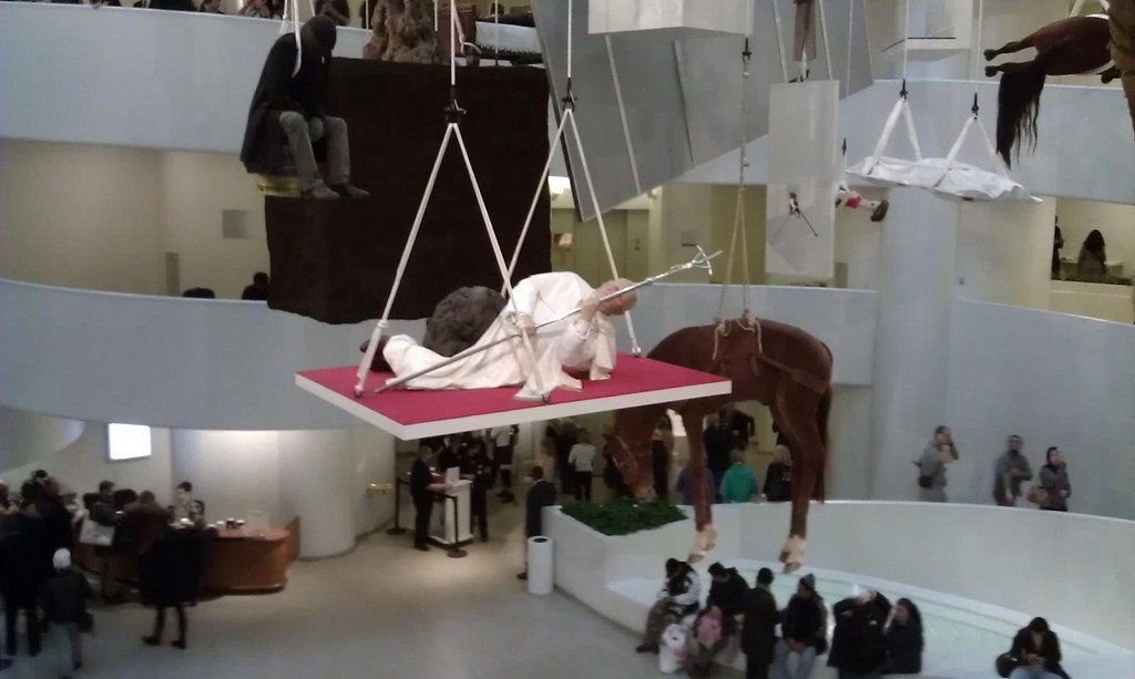 Taxidermied animals are stand-ins for humans. The powerful horse is reduced to a dead body. The tiny squirrel dies at the kitchen table. Cattelan ‘s use of Mme. Toussaud-like fleshtones parallels the taxidermied animals. The themes of death and powerlessness bring to mind the themes of another wax-works-style sculptor, Ron Mueck.