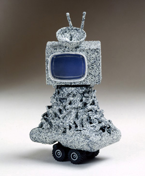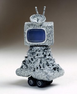 Work by sixteen artists and collaboratives, produced from the 1960s to the present, reflected the continuing relevance of McLuhan’s ideas; all addressed aspects of the impact of changing technology, from letter-writing and typing to the World Wide Web. As one might expect from the subject, much of the work utilized technology (largely video, but one piece also incorporated the Web), although the range of media was broad, including a collage of typewritten texts that were stitched together by hand (Elena del Rivero’s Mended Flying Letters, 2010), artists’ books (Wolfgang Plöger’s Google Image Search (Map), 2006, which consisted of several volumes of images transcribed from a Google search for map), photography, and small-scale sculpture (Joan Rabascall’s 6″ model, Monument to Mobile Television, 1974). It was a challenging and unexpected selection of work which avoided conventional categories.