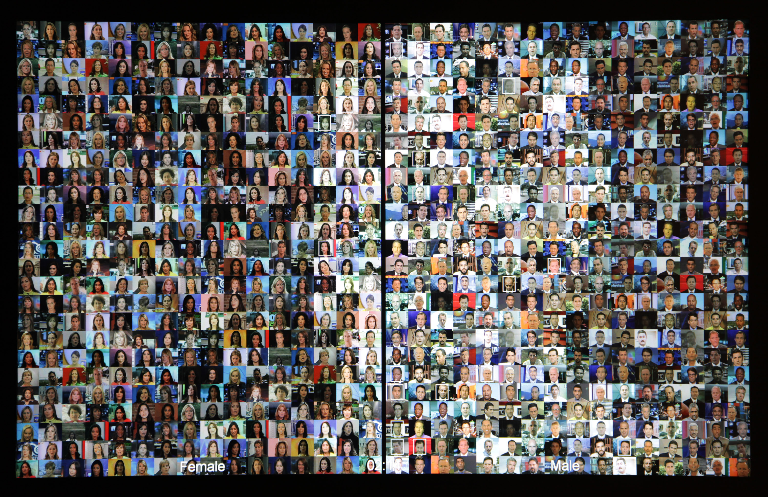 Reporters with Borders (2007), Raphael Lozano-Hammer’s interactive video work, was activated by the presence of a viewer, whose silhouette appeared on the screen filled with tiny images of Mexican broadcasters on one side, Americans on the other, who began to speak; they produced simultaneous, cacophonous newscasts, yet remained segregated by country.