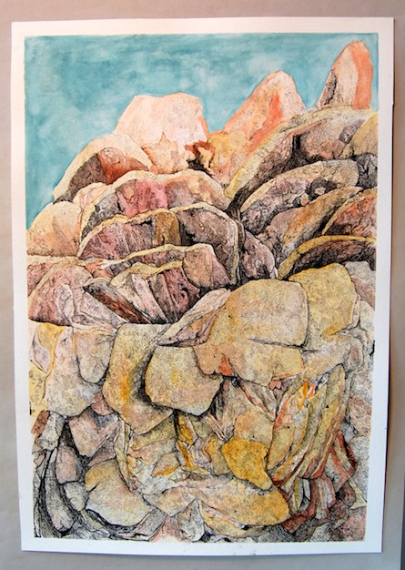 A dozen neatly framed ink drawings circle the walls of the Grizzly gallery, including portraits of petrified wood, mountain landscapes and a picture of a collapsed house on top a pile of garbage at a landfill.