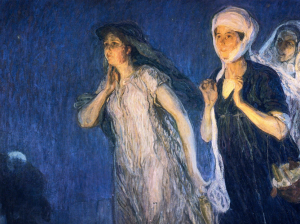 The most unusual aspect of Tanner’s work has received no significant discussion that I know of: his palette, most specifically his tendency to emphasize tones of blue, particularly in religious scenes; some are so exclusively blue that the paintings could be considered monochromes. Some are set in the evening, and blue is commonly associated with twilight; indeed, the French use the term l’heure bleu. But not all of Tanner’s blue paintings are obviously set at dusk or nighttime. The unnatural coloring certainly situates them beyond a realistic representation of observed visual effects. It also creates an affinity among a group of works that portray ordinary human activities performed in the presence of the divine. This highly personal and deeply felt recasting of religious imagery makes the most persuasive case for Tanner’s modernity.