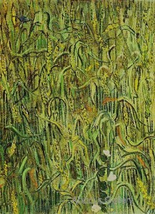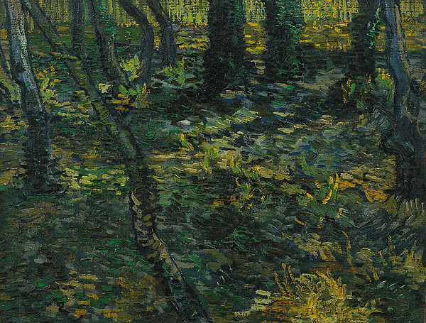 The third intriguing aspect of Van Gogh’s work is evident in only a few paintings which, rather startlingly, have no discernible focal point. They are the sort of all-over painting we associate with Abstract Expressionism; Pollock avant la lettre. Examples are Ears of Wheat, several paintings of undergrowth (both above; the exhibition contains a variant of Undergrowth, also from the Van Gogh Museum, Amsterdam), Acacias in Flower (Stockholm) and Dandelions (Winterthur). While the exhibition is organized around paintings which emphasize a close view, either zooming in on details or distant views in which there is equal focus on fore, middle, and backgrounds, that is not equivalent to these more radical, all-over compositions. Most of the close up compositions delineate forms by color, if not by increased clarity of focus, so that, while rejecting conventional devices to indicate recession, they still retain fore and back-grounds. The subjects of the all-over paintings exist in an undifferentiated space.