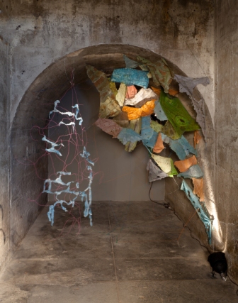 At the end of his dance-concealed-as-labor, as he leans against the sweat-streaked wall, Cohen confesses the history of his installation through heaving breaths. Just as the narrow walls shape his movements, his installation has shaped the space, he says. Many artists effectively transform the basement’s dark caves into installation space or project their video work inside its tiny tunnels. The archway constraints limit the number of viewers who can enter a space at one time, providing the best vantage points for video of any gallery I’ve ever visited.