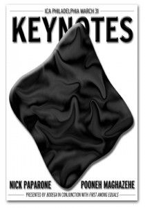 Former Philly artist Nick Paparone, known for his elaborate and unhinged performances, and Pooneh Maghazehe present “Keynotes,” the first performance in the series that Bodega organized for First Among Equals at the ICA. It begins this coming Saturday, March 31, at 2pm.