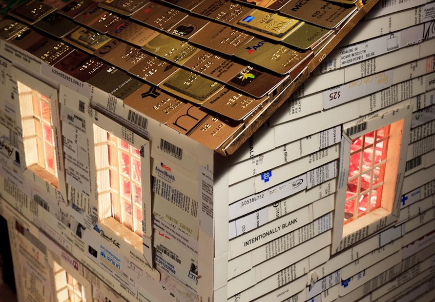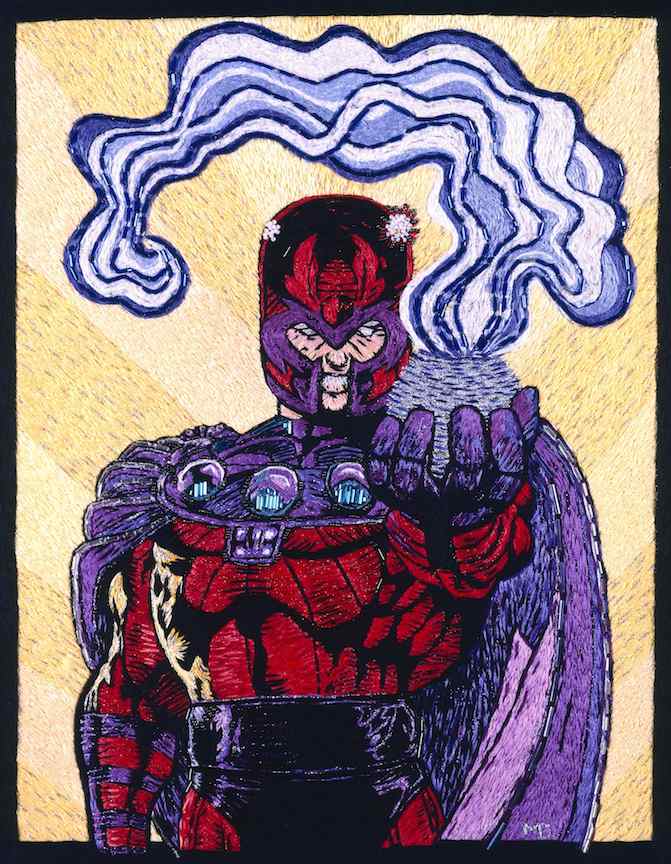 Orr’s “House of Cards” is an example of where fiber art may be headed. The three-dimensional piece is not woven or stitched, but its focus on repetition, obsession, and incredible amounts of laborious work reflects the core of textile and fiber art. Orr appropriated a wood doll house that is a scale model of a real house once owned by a friend. She covered the house, inside and out, with carefully selected and positioned credit cards, insurance cards, and bank cards, all expired, all throwaways. While tiling a house with plastic bits of consumer culture may not sound like fiber art, Archer equates it to quilting. “Orr effectively ‘quilts’ using credit cards, riffing off of those traditional geometric patterns, but since she’s not using fabric, the ‘fiber’ element of her work is more in the assignment of a recognizable graphic look to her piece rather than the technique used to create it,” Archer said. “So you could consider it a kind of descendant of ‘fiber art’ as we used to know it.”