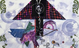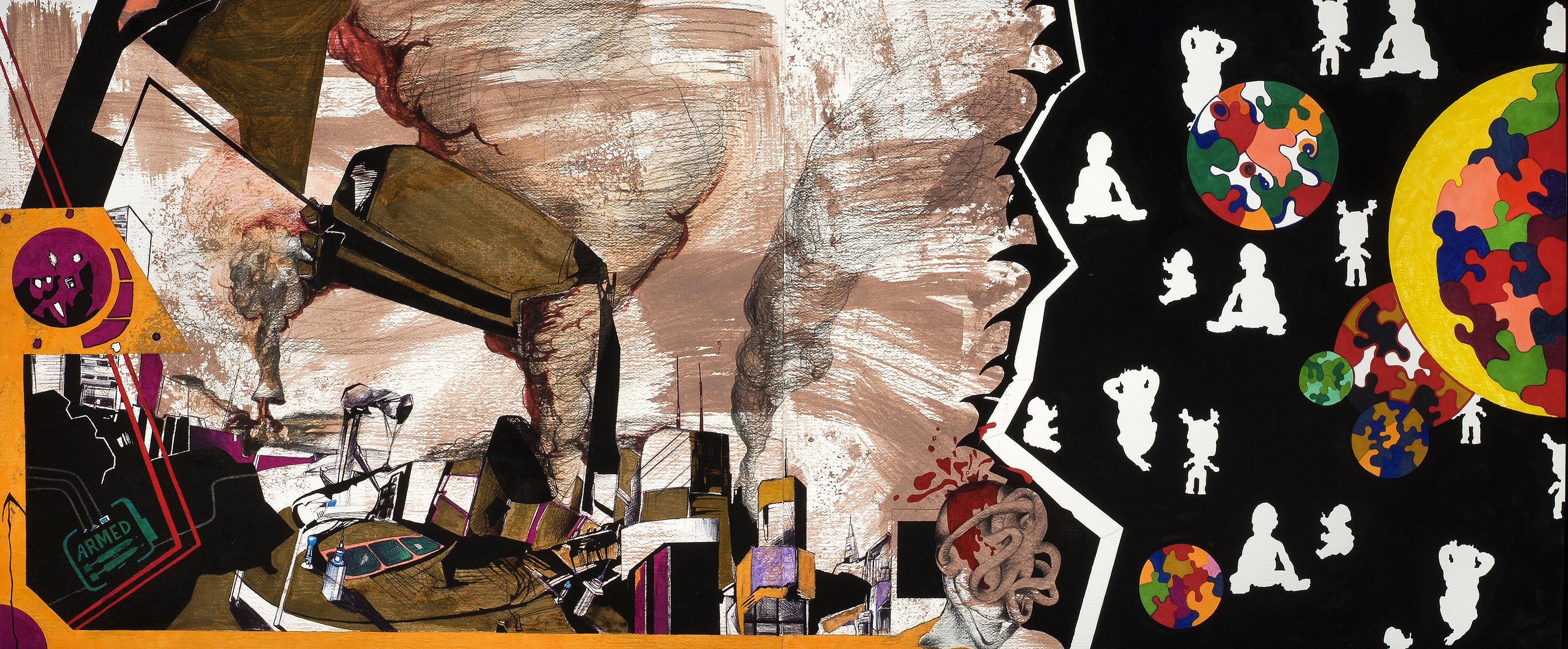 Among the works displayed in the gallery, Milushev has some older pieces as well as new work and a number of pages from sketchbooks, which led to the final versions. One piece entitled “Atomic Playground” demonstrates Milushev’s illustrative style rather well. The work is divided into two main parts, two-thirds to the left, one-third to the right. The left side pictures a cityscape before a muddy orange sky and plumes of graphite smoke. Some type of mutant lingers near the bottom, doused in blood, and the whole scene registers as agonizing; the aftermath of a nuclear holocaust. The right side shows the white silhouettes of cartoony children floating amidst multicolored balls, which fit together like puzzles. Obviously this section is the “playground” part of the title and hints at the innocence and whimsy that divides our everyday lives from the fear of atomic war. With Iran and North Korea rattling their swords of late, the fear of annihilation is no longer a distant relic of the Cold War.
