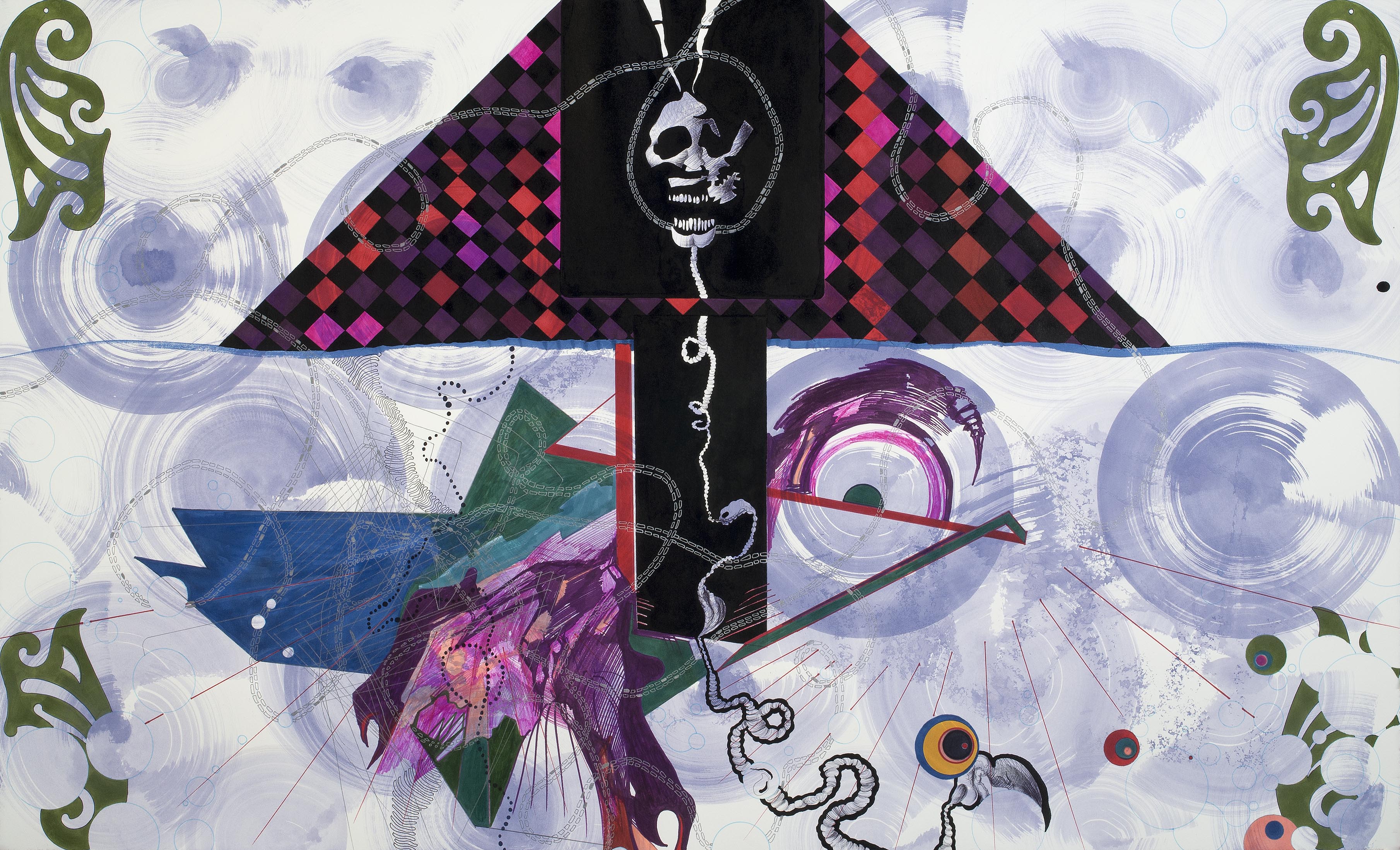 Another piece of particular note is “In the Search of Water.” Here Milushev takes hold of another contemporary issue, but one that American and Western society is generally far removed from: clean water. A cool blue background of circular patterns mimics the ripples of a pond, but it appears distant. Nearer and much bolder is a dark, hard-edged form bearing an emaciated, skull-like face. The tenuous organic forms and the skeletal head imply that life is barely clinging on. With famine and drought across huge parts of Central Africa, much of the world knows full well the misery of thirst. When the nearest faucet or bottle can provide us with fresh, clean water, the idea of searching for a drink seems very much a world away.
