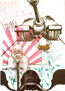 The artist’s sketchbooks provide a look at some of his process. One page holds what appears to be the origin of his title “Atomic Playground” and pictures a tank and gasmask as well as a foreboding military figure with a helmet that mirrors German World War II garb. A lot of the sketches on the page were scrapped in the final version in favor of a general anti-war sentiment. He focuses on the cityscape and the air of destruction instead of infantry and tanks – both of which would be essentially useless in the face of a massive bomb.