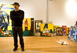 Rick Prol’s “Weegee” at the Grey Art Gallery in Williamsport, PA is a throwback to a New York when the world was black and white and crime scenes dominated the news, the streets and the public’s imagination.  The artist whose career surfaced from the rubble of the East Village scene in the 1980s, captured a similar sort of crime world with his own art.  Like Weegee (Arthur Fellig) who roamed New York’s Lower East Side looking for, finding and dramatizing death, Prol is also a legend who scratched the surfaces and came up with something equally unsettling and equally beautiful.  He’s still at it: “Weegee” imbues New York’s landscape with his iconic “cartoon expressionism,” and a world of hot paint featuring cat-like losers with broken bottles, knives and nails in their necks and heads. Here his characters attempting to cross New York City on a broken down bicycle sink into a nuclear slime; buses fly through a blood red post-apocalyptic sky, soldiers advance legless, bodies pile up along brick walls, and cars are stacked on top of each other, rusting into eternity.  There’s no hope in this Weegee World, but the brutality of living grinds on. And there’s a beauty to it all. Rick Prol: “Weegee,” on view from April 5 – May 12, 2012.  See Grey Art Gallery  for more gallery images and exhibition details; download the PDF catalog here.