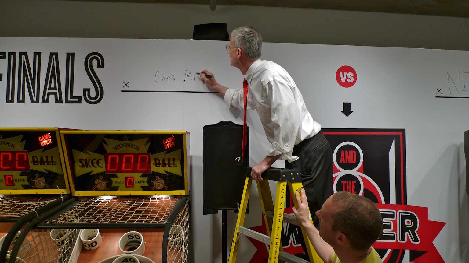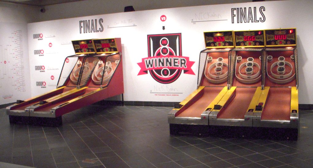 This being art, there was interesting stuff to look at — of course the skee-ball machines, and the specially-designed vinyl wallpaper for the tournament walls, which laid out the tournament brackets to be filled in by hand as games got played and winners advanced.