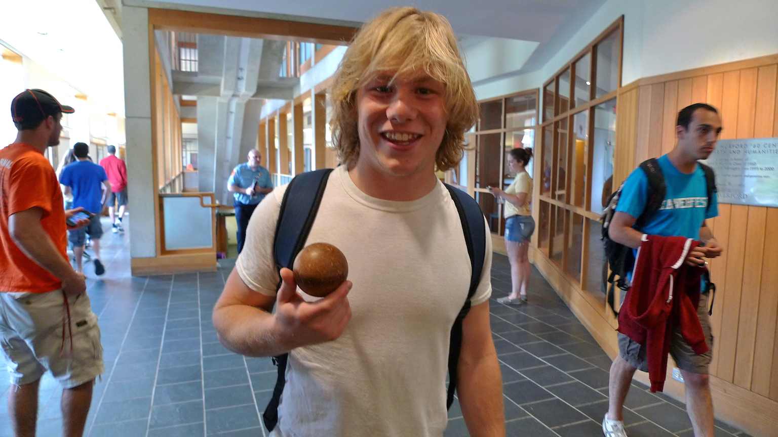 729 people played skee-ball in the first weeks, on machines set up in front an audience sitting on bleachers. And among those who advanced to the sweet sixteen were 13 students, 3 staff members and one faculty member. The final game saw sophomore Nick Kahn, a double major in English and French face off against Haverford Director of Communications and alumnus, Chris Mills ’82. And the winner is Nick Kahn! For his prize, he was flown to Greensboro, NC, for 6 hours of fun, to be feted by artist Lee Walton (who had been a part of the ancillary programming for the show) and friends. Kahn, it turns out, has a grandmother in Greensboro, and he asked whether she could join him for the celebration.