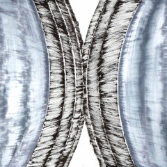 Colin Keefe has a pair of meticulous pen drawings that are extremely easy to get lost in. They appear as a midpoint between aerial shots of urban areas and bacterial cultures. It’s as if a large swath of land from the islands in Dubai somehow began to grow on its own volition. Sections of the patterns are organized into grids and right angles, but as the eye follows their path, they begin to melt into more winding and biological masses. Anyone who has flown in an airplane can easily see the parallels between urban sprawl and microorganisms’ reproductive habits. It would be going a bit far to assume Keefe thinks humanity is a virus; however, the way his forms fan out across the paper does tend to imply that even the most industrial of constructions is ultimately a byproduct of life.