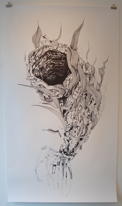 Sarah Laing also works in pen and ink, but her drawings are more plant and animal hybrids than anything remotely mechanical. The organisms in her pieces resemble cornstalks or some type of tall weeds at first glance. At further inspection, the details actually look like they have joints, bones, or even skin. It’s as if human fingers or other animal-like appendages are emerging from within the plants’ stems and leaves. Even the most divergent of life forms actually share a huge portion of their genetic makeup. The difference between a dandelion and a dog is relatively small as far as DNA is concerned. Laing seems to be of the mindset that – whether animal or plant, human or otherwise – all life shares an astonishing number of characteristics even in the face of its diversity.