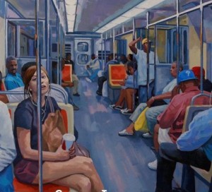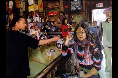 “Art as part of the real world” is a key phrase I keep seeing here. Tiberino’s transformation of photographs into mural-style works relies on the awkward candor of the subjects: a disembodied female leg here, a bored-looking face caught off guard there. He never stops directing you to mundane background events, moments, and gestures. The Dirty Frank’s painting, with its sheer size, is the strongest example. The girl in the foreground, gazing forlornly out at you, is riveting in her solitude, but after a few moments, you notice who’s sitting around her, oblivious to her focus. Then you see the regulars in the background, begin to think of them as characters in a tableau, absorbed in some riotous retelling of a lost weekend. Tiberino’s taken you into their world and given you authorship at the same time.