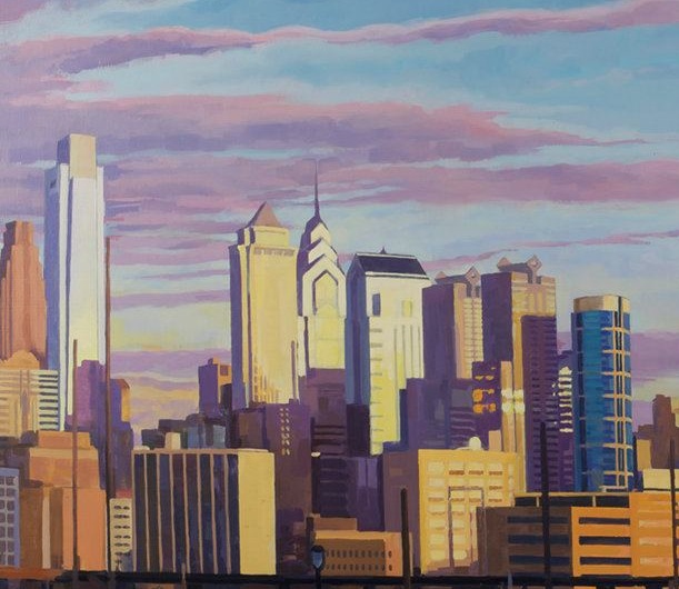 The painting also takes great care with Philly’s unmistakable light pollution casting its wan glow over Tiberino’s partygoers. Then, in a respite from the crowds, there is the titular piece of the show, with its dappling of pastel sunrise over the buildings of Center City. Looking at the rendering of the cloud mass on the Cira Center and the gentle blend of its colors, you can practically sense the morning chill.