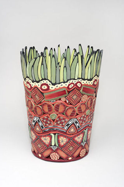 Emily Squires Levine’s works in polymer clay were interesting as well. Using a cane technique, similar to that of glassblowers, Levine creates patterns after coloring her clays. We found the result appealing and really loved the level of detail present in each of her bold pieces.
