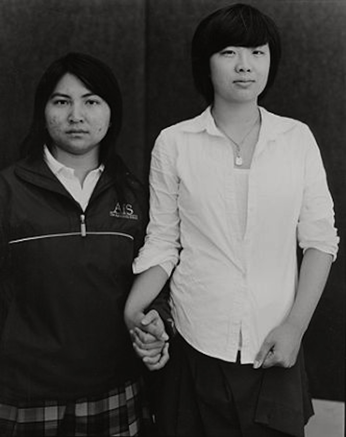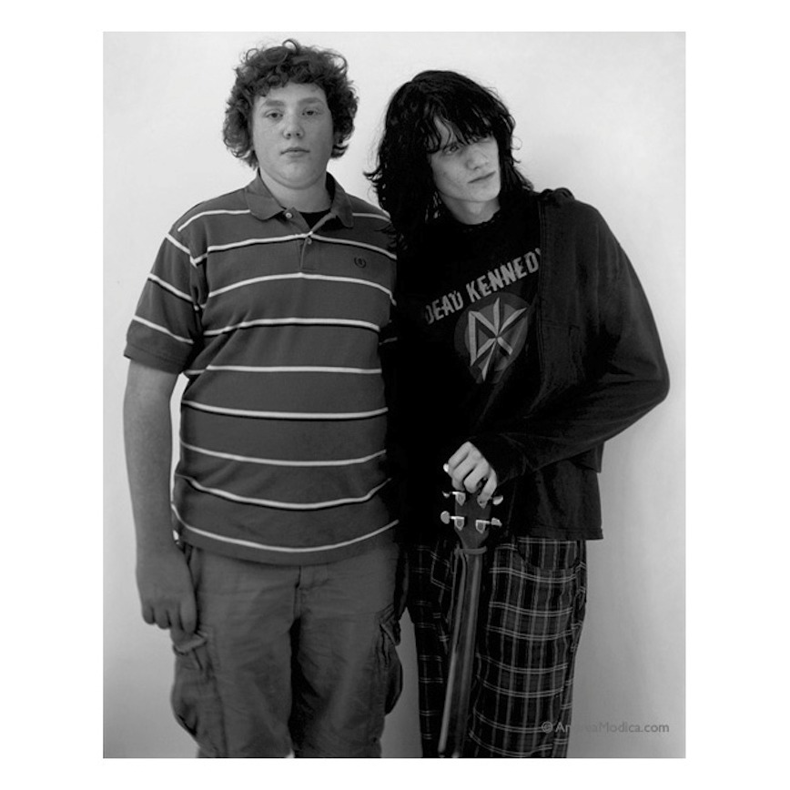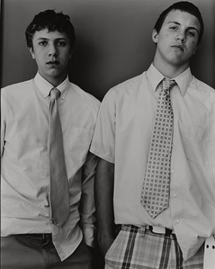 The 23 Modica images on view here depict high-schoolers from art and prep schools in Italy, the Philadelphia area and Connecticut. The artist set out to shoot one student at a time, “but the ‘best friend’ kept showing up,” she said. So she began photographing the best-friend pairings. What you see in works that date from 2003 to 2012 are sober-faced youth leaning into each other, holding hands, hugging or standing rigidly far apart.