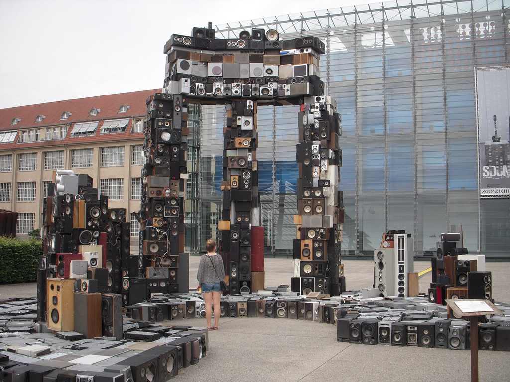 Karlsruhe, which is the home of several courts has a couple of contemporary art museums. Sadly they were closed when we were able to go. The ZKM museum, run by artist and curator Peter Weibel (who showed at Slought in 2009) had a sound art show, which would have been great. What we did see was a nice piece by Benoit Mabrey outside the museum on an otherwise forlorn plaza. Made of discarded stereo equipment the piece groaned and clacked and seemed to be transmitting some radio program from the great beyond.