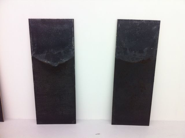 Throughout De Leersnyder’s studio we see fragments of plaster and  dried expanded joint filler  protuberances shaped all at the limits of their expansiveness and their skins and  their molds. Everything is bound  by a comfortable limit. And then there is the dust. Dust falls where it will. It knows no bounds. De Leersnyder  lets the dust of her studio  settle on and around her work fragments like a time machine drapery.   Sometime later  she lifts the fragments up and away to reveal prints  like x rays (dust ray?).
