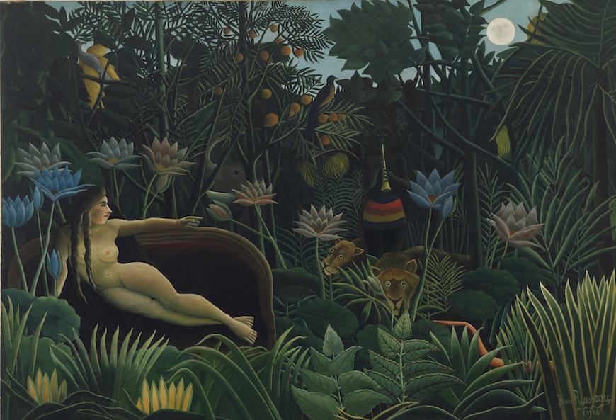 Desire, in the exhibition, is for a land of endless food, drink and sexual fulfillment, where humans lived in harmony with nature. Vergil’s Eclogues depict Arcadia as always shadowed by death, as does Poussin; one of his best-known paintings shows a group of Arcadian shepherds looking at the inscription on a tomb which reads: Et in Arcadio Ego – loosely, Death, too, is in Arcadia. But for most modernist painters, Arcadia was usually depicted as a pagan Eden, without the threat of sin, expulsion, or any consequences of overindulgence. In modern Arcadia it is always a sunny day, a land of outdoor picnics and daytime lovemaking.