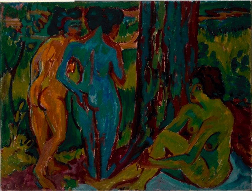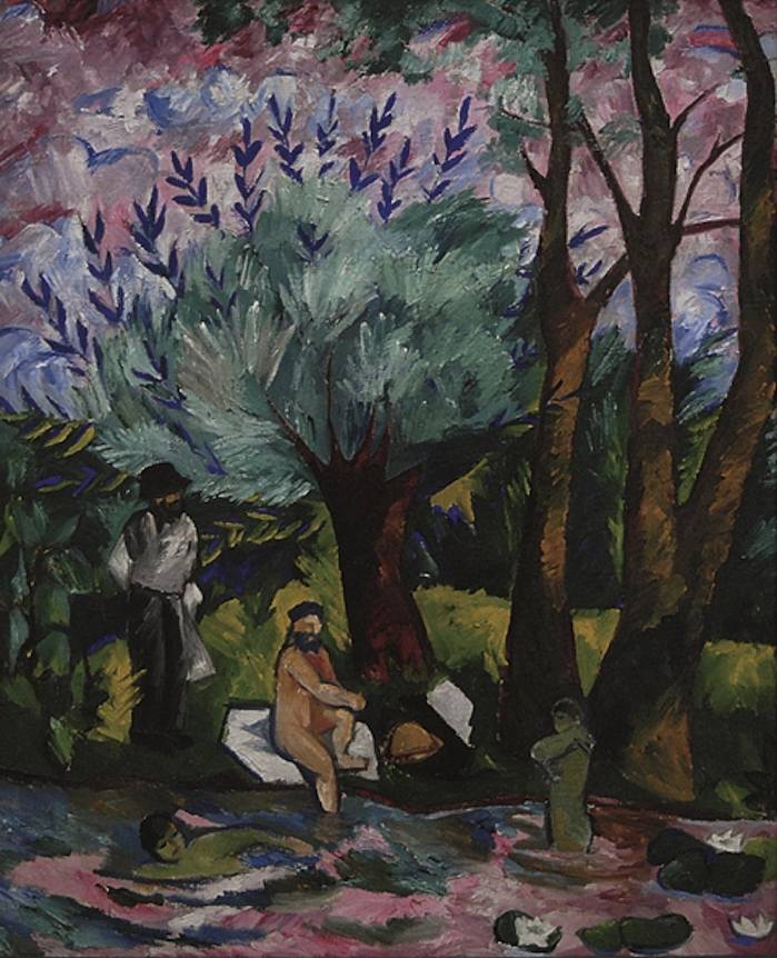 The final room forms an intriguing coda, for it presents a group of German Expressionist paintings and two by Russians, that show the Arcadian tradition beyond France. Boys Bathing by Natalia Goncharova displays the exhibition’s one spot of humor, for on the riverbank sits a male figure holding his bent knee, surely a citation from Manet’s Dejuner Sur l’Herbe, but Goncharovna has stripped him of all of his clothes but his black cap. The Germans had their own contemporary enactment of Arcadia; Naturist groups were common during the period and artists had nudist holidays in the countryside. We see paintings of their activities by Kirchner and Pechstein. There are also several of Franz Marc’s utopian idyls, the last dated 1913. Following World War I and the horrors of modern warfare, the myth of Arcadia had lost its promise.