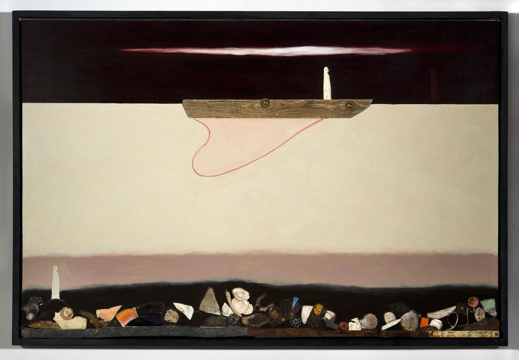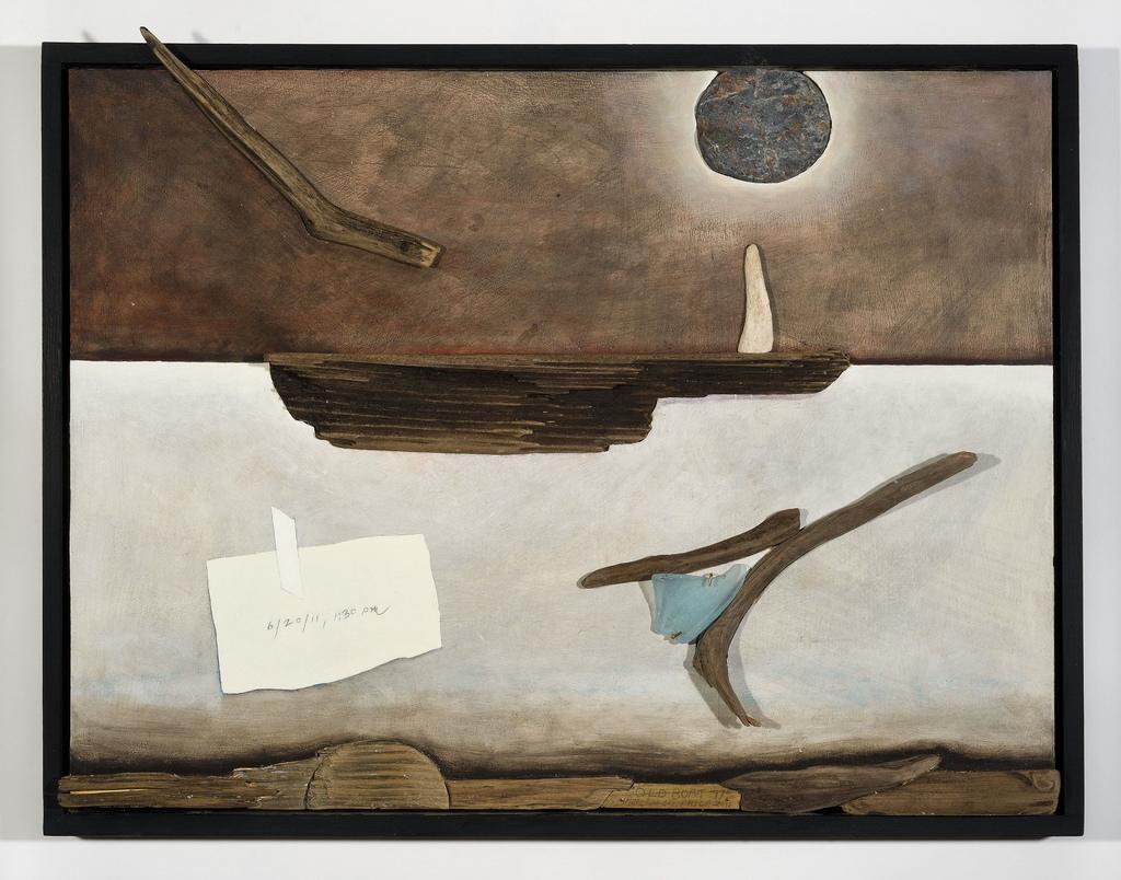 What I saw in this visit is completely in keeping with what I saw in 2004 — gorgeous, spare, iconic works, with a restrained pallete and sly additions of found natural objects (driftwood and stones from beaches in Maine). This time the beautifully-crafted works involve a boat as the main character and symbol, instead of a head or airplane.