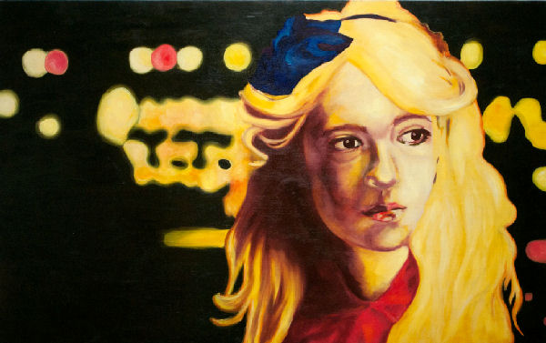 Walking into the current exhibition in the Project Space at Crane Arts, a viewer is greeted by bright and colorful portraits that almost look like movie stills. That is because Girls on Film is a study of the relationship between painting and moving images, between pop culture and feminine identity. Artist Kate Perkins used many pieces from her recent senior thesis at University of the Arts, as well as others, to compose this show, and the result is a vibrant and engaging exhibition.