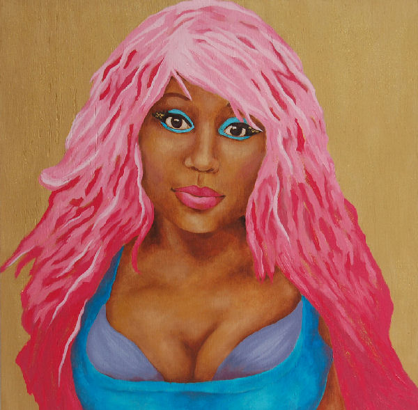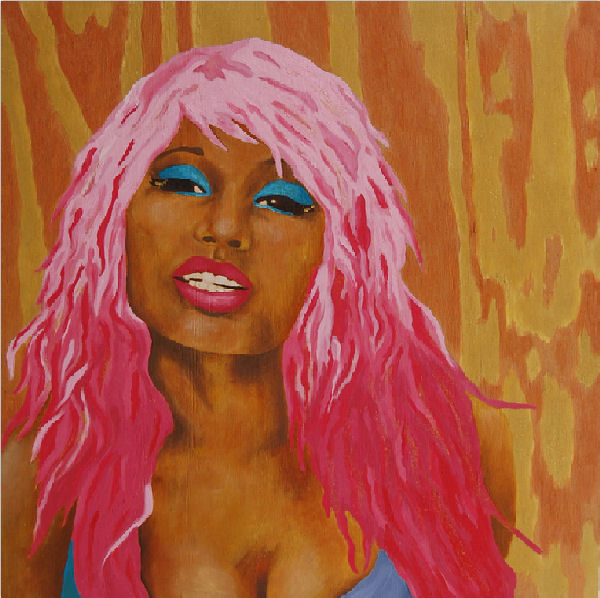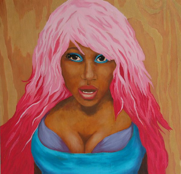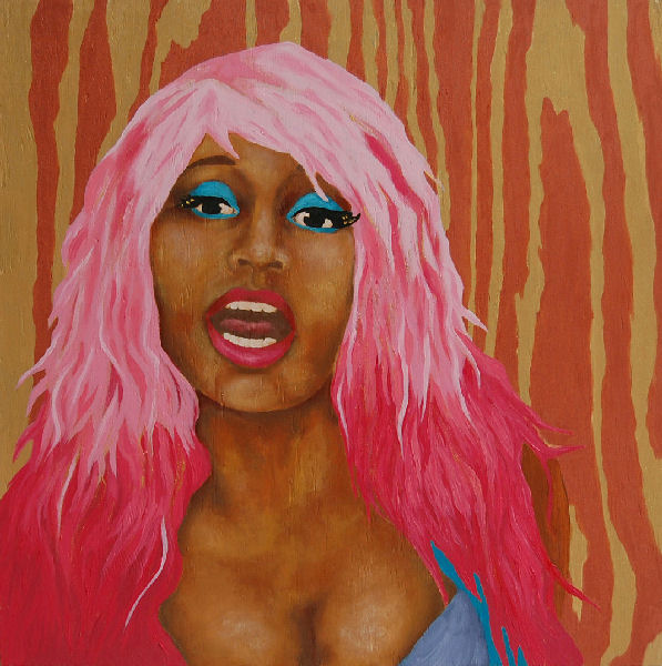 Most notable in the show are four paintings of pop star Nicki Minaj taken from her music video “Superbass.” The works, titled “Superbass #1” through “Superbass #4,” exemplify all of the themes mentioned earlier: lush colors, pop media, femininity. What makes these paintings even more interesting is that Perkins has created an animated slideshow using a bar code scanning app to make the animation available by smart phone at the exhibit. I simply had to take a picture of the barcode next to the paintings to download the animation. To see Perkins’s animation, click here.