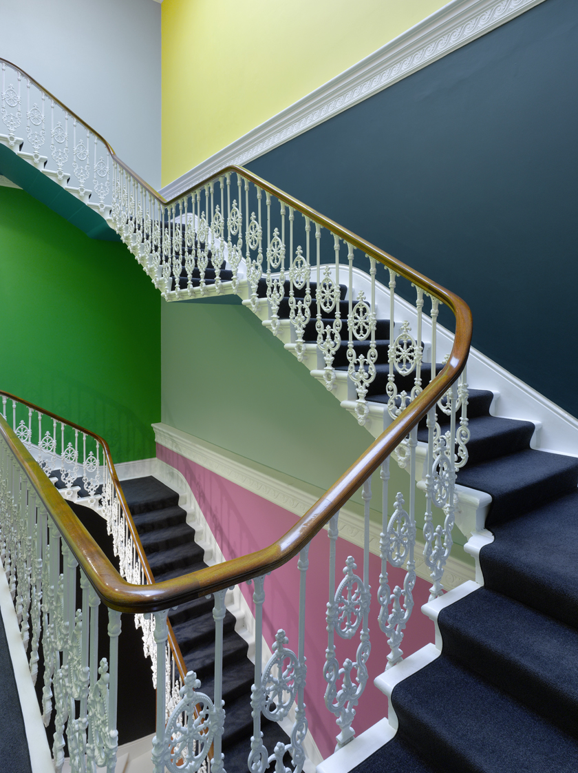 My interventions for the stairwell and terrace at the same time work with and comment on the spaces where they are located. I painted the walls and ceilings of the historic stairwell on five floors in 27 different colors determined by a throw of dice. Although the work is highly seductive, the introduction of chance subverts the traditional idea of iconography and the representative role of the artist and architect, while the sculptures for the terrace – playing with notions of kitsch and monumentality – usurp the idea of a corporate identity. Together, all of these works relate to the building and allowed me to explore ideas about inside and outside, inclusion and exclusion, and disclosure and discretion.