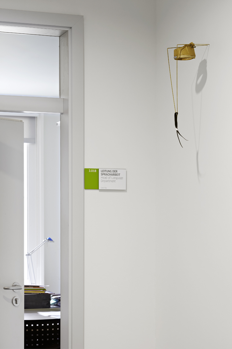 In this respect, an important link between these projects is the involvement of people outside the art world, beyond the “art context.” As opposed to the philosophers’ beds, which where shown in gallery settings, the present commission allowed me to expand the social notion of my work into space: Following interviews with staff members at the Goethe Institute, I installed 30 small-scale sculptures spread around the entire building – one for every department and field of activity, including the janitorial workroom! A specific use of materials, fixing methods and symbolic fragments enabled me to imagine a lurking network of secret relationships. This spatial intervention feeds back into the Institute’s social network, as the interviewees now wander around the building investigating each others’ objects and professional functions.