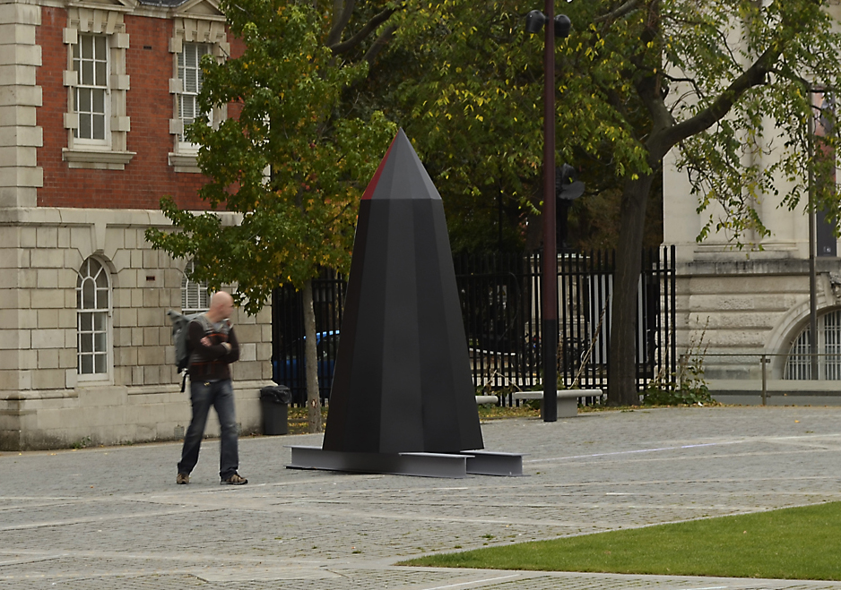 The large sculpture found its place behind the window opposite the building’s main entrance, where it extends the axis between Exhibition Road and the Park. It becomes the counterpart of the main stairwell’s vertical axis. The sculpture’s pill-shaped belly and its red plinth further stress this spatial dynamic. The juxtaposition of this slick and almost industrial steel structure and the rather organic, painterly quality of the upper part also came about during the working process.