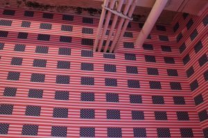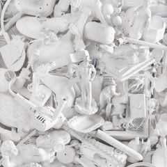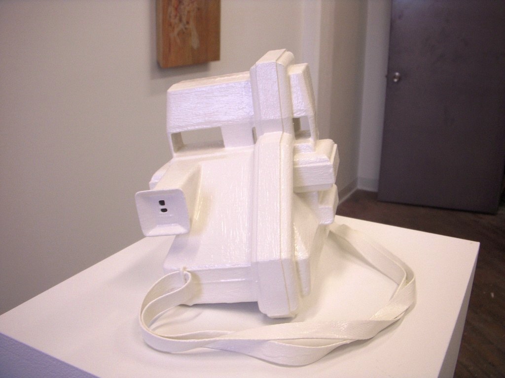Christina P. Day’s work is the first point of contact for visitors. A white-washed, immaculate Polaroid camera sits on a pedestal in the middle of the room. Among her influences, the visual language of architecture is notable. She approaches her found art constructions like a carpenter, and it shows: the Polaroid has the antiseptic appearance of a small-scale architectural model.