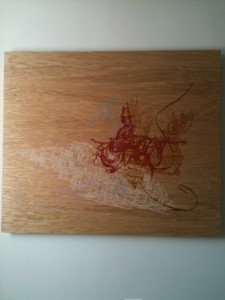 Alexis Nutini’s prints are impressionistic collages of his early life. With a background spanning Mexico and the U.S., he uses stencils and paint on wood to combine images that represent his transitory upbringing. These pieces are charmingly eclectic and unmannered, with ink that bleeds over lines and borders speaking to his cross-cultural background. There’s also meshing of organic and manmade images, but it’s never immediately obvious what any of the images are supposed to be – and herein lies the one stumbling block in his work. The pieces are not terribly inclusive of the viewer; since everything in these busy prints on wood is so open to interpretation, the viewer is left guessing at what she is looking at and what it could possibly mean.