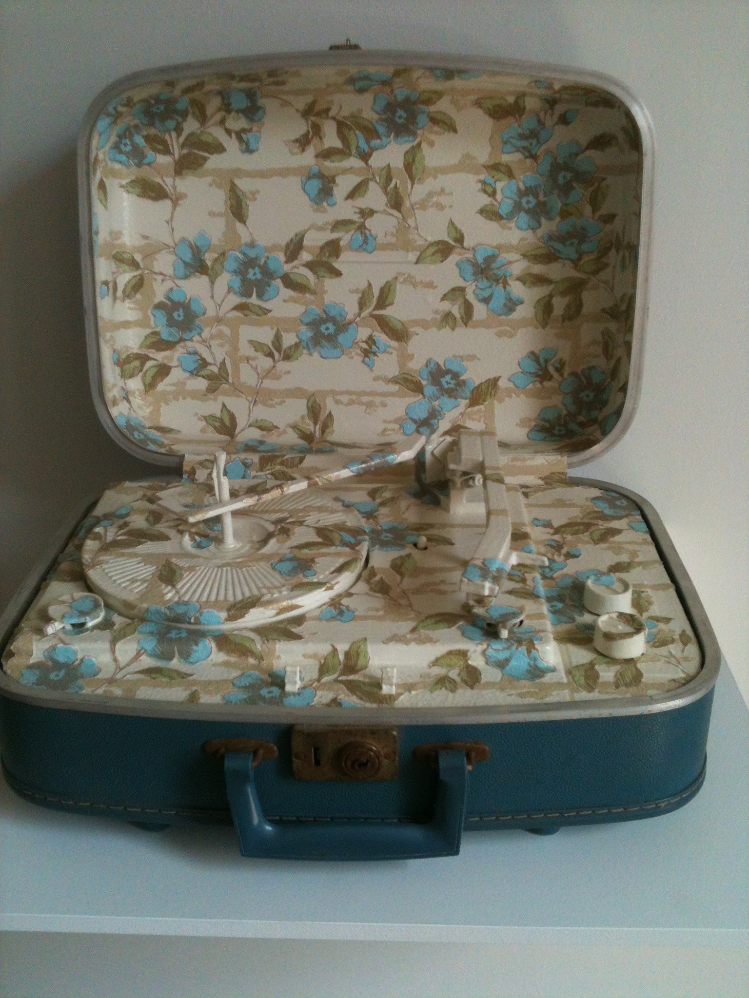 Her other piece, “Blue Brick 45,” is a found 45 case whose interior is done over with wallpaper that recalls a 1950s kitchen. She uses objects with clear nostalgic significance.