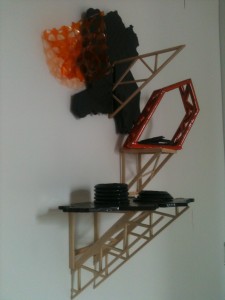Well aware of the conflict of finding manmade structures beautiful, Matt Ziemke goes with it regardless. His 3D miniature pieces use shapes and structures found in oil rigs, roads and bridges, and transform what are essentially cold, utilitarian forms into something more playful. The works don’t concern themselves much with the impact the real world infrastructures hinted at here have on the land. Although, pieces like “Conglomerate No. 2” are aesthetically attractive, neon-bright, and – most tellingly – precarious in some way, which suggests he is diminishing their authority. It’s a neat way of breaking their power. There’s something cleverly evasive about his approach, because it eliminates the imposing nature of these structures in the service of rationalizing his fascination.